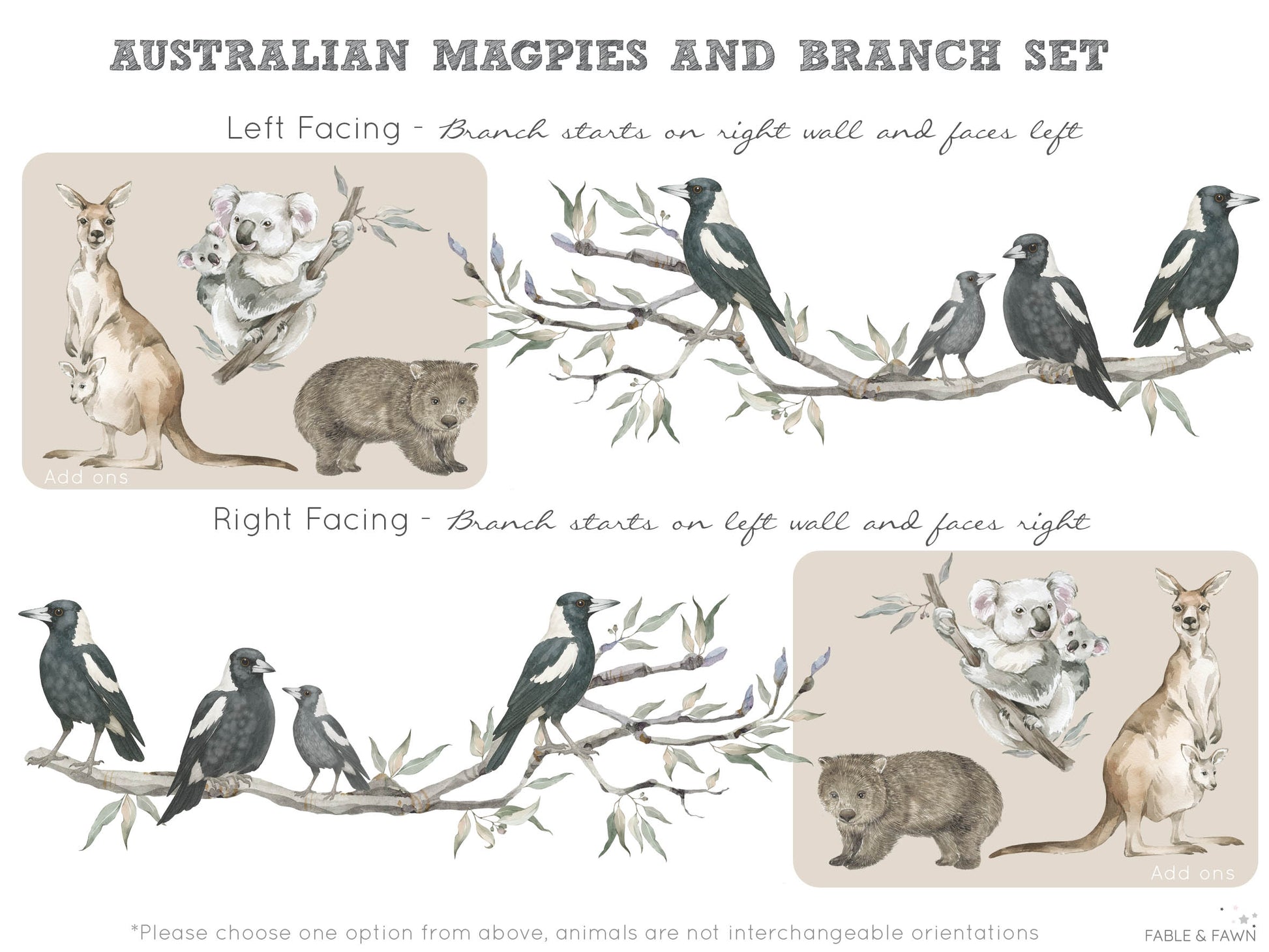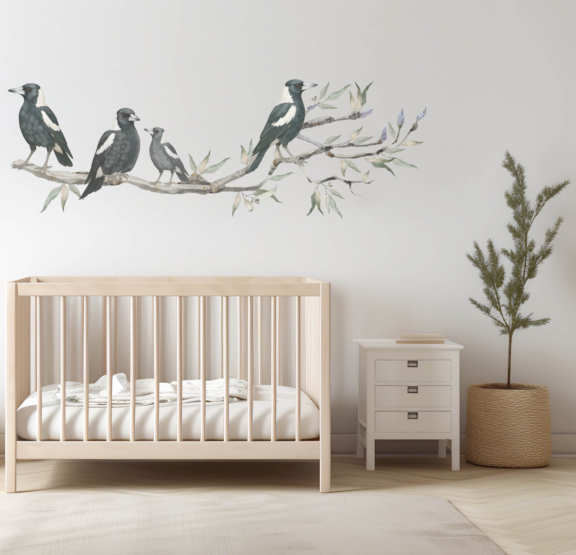 Transform your wall into a beautiful reflection of the Australian bush with our Extended Gum Tree Branch featuring a family of magpies — a stunning wall decal set designed to bring warmth, wonder, and wildlife into your nursery or child’s bedroom.